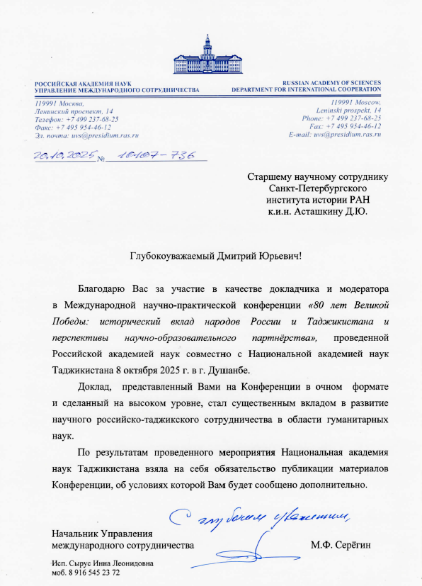 8 октября 2025 г. в Душанбе, в здании Национальной академии наук Таджикистана (НАНТ), состоялась международная научно-практическая конференция «80 лет Великой Победы: исторический вклад народов России и Таджикистана и перспективы научно-образовательного партнёрства».