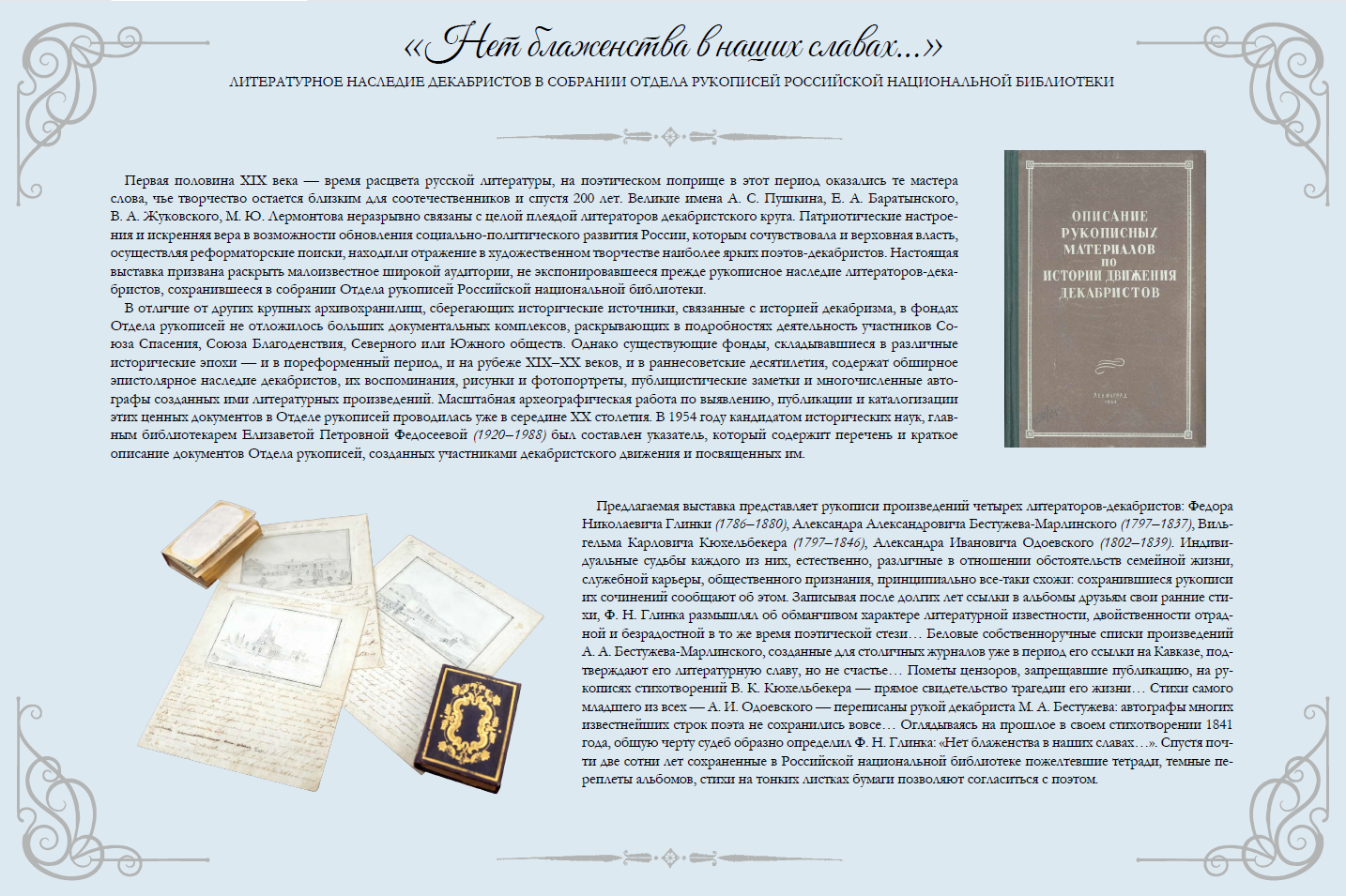 17 ноября 2025 г. в первый день работы Всероссийской конференции с международным участием «Декабристы в исторической судьбе России. К 200-летию выступления на Сенатской площади (1825 — 2025)» в здании Санкт-Петербургского отделения Российской академии наук открылась планшетная выставка «Нет блаженства в наших славах…»: литературное наследие декабристов в собрании Отдела рукописей Российской национальной библиотеки».