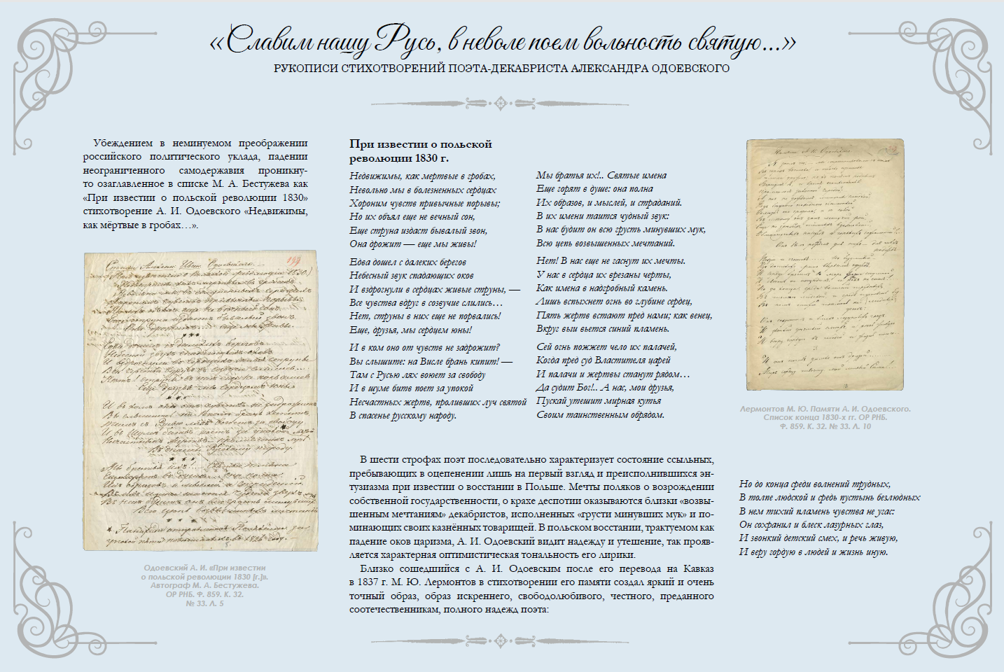 Планшетная экспозиция, созданная в рамках партнерского сотрудничества Российской национальной библиотеки (РНБ) и издательства «КУЧКОВО ПОЛЕ МУЗЕОН» при поддержке фонда «История Отечества», посвящена уникальным черновым и беловым автографам, спискам известных литературных произведений Ф.Н.Глинки, А.А.Бестужева-Марлинского, В.К.Кюхельбекера и А.И.Одоевского, хранящимся в ОР РНБ.