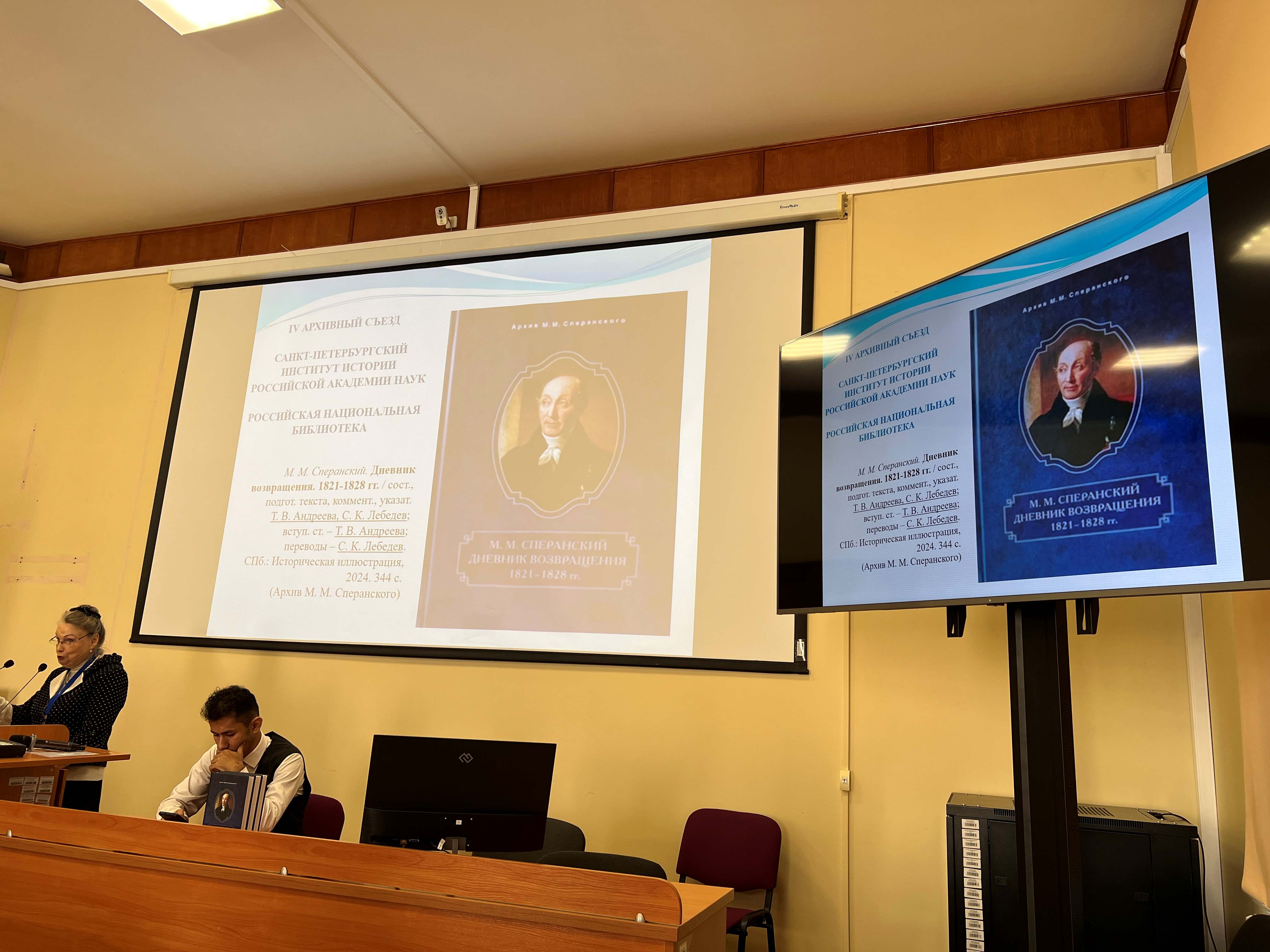 В рамках IV Архивного съезда 8 октября 2025 г. в Институте истории Санкт-Петербургского государственного университета (Менделеевская линия, д. 5) состоялась презентация книги «М.М.Сперанский. Дневник возвращения. 1821-1828 гг.». Публикацию представили составители тома: д.и.н., и.о. зав. отделом Новой истории России СПбИИ РАН С.К.Лебедев и д.и.н., г.н.с. того же отдела СПбИИ РАН Т.В.Андреева.