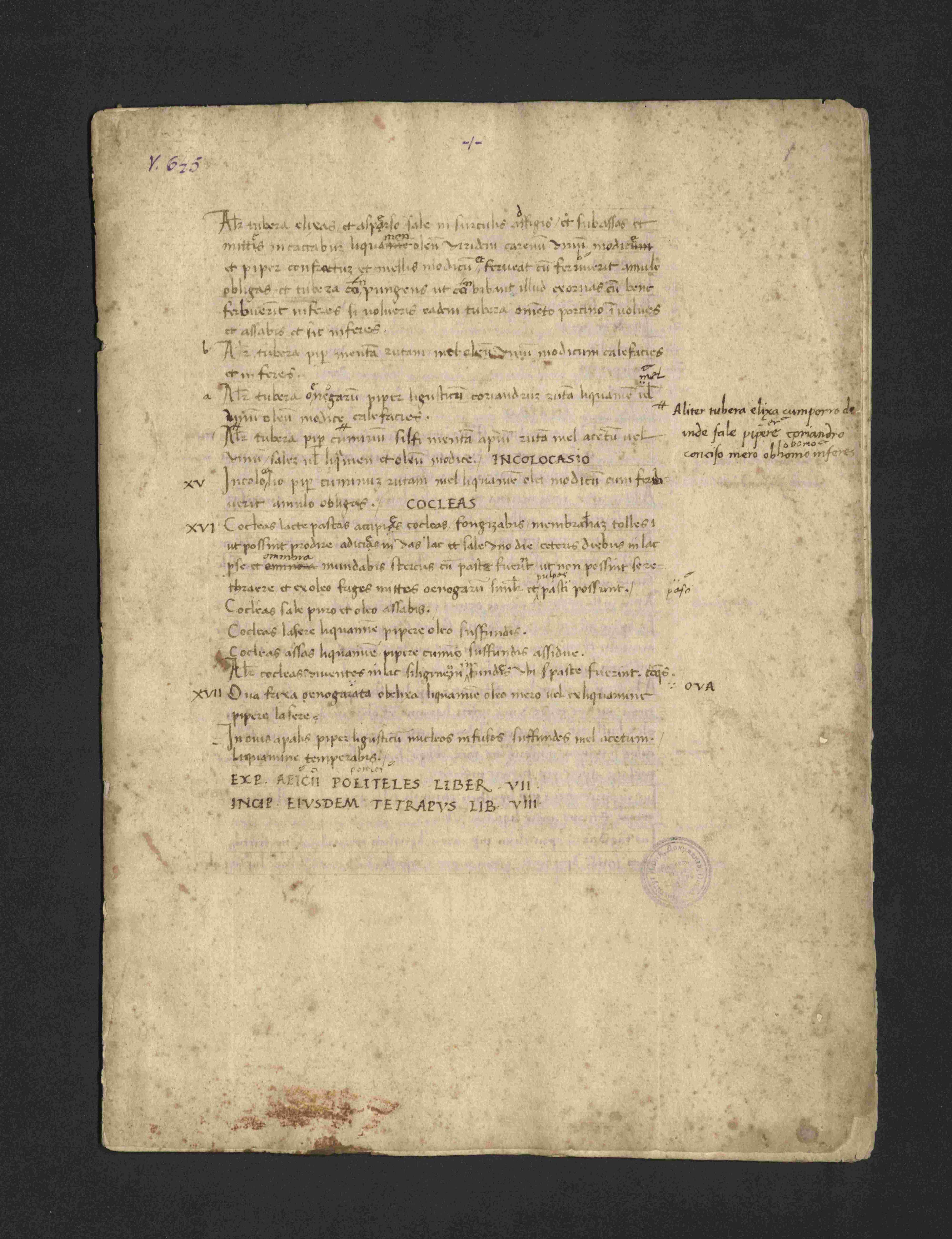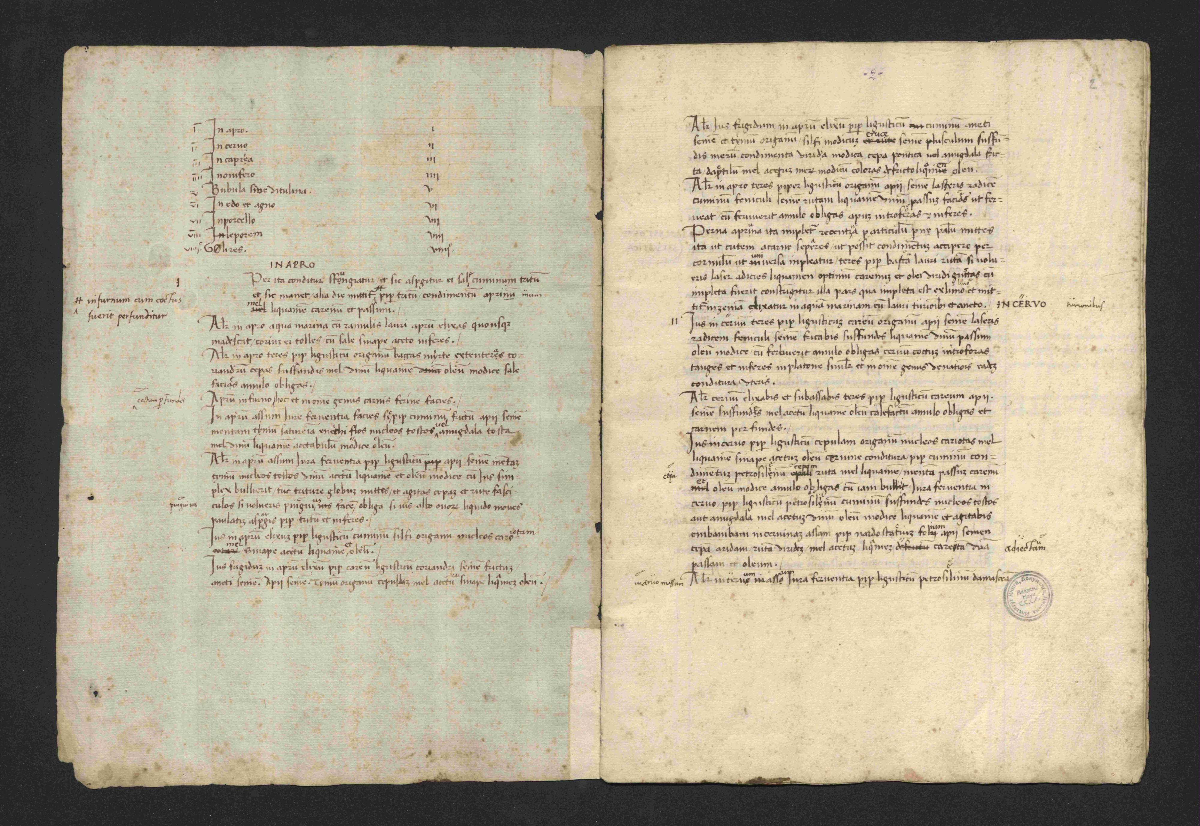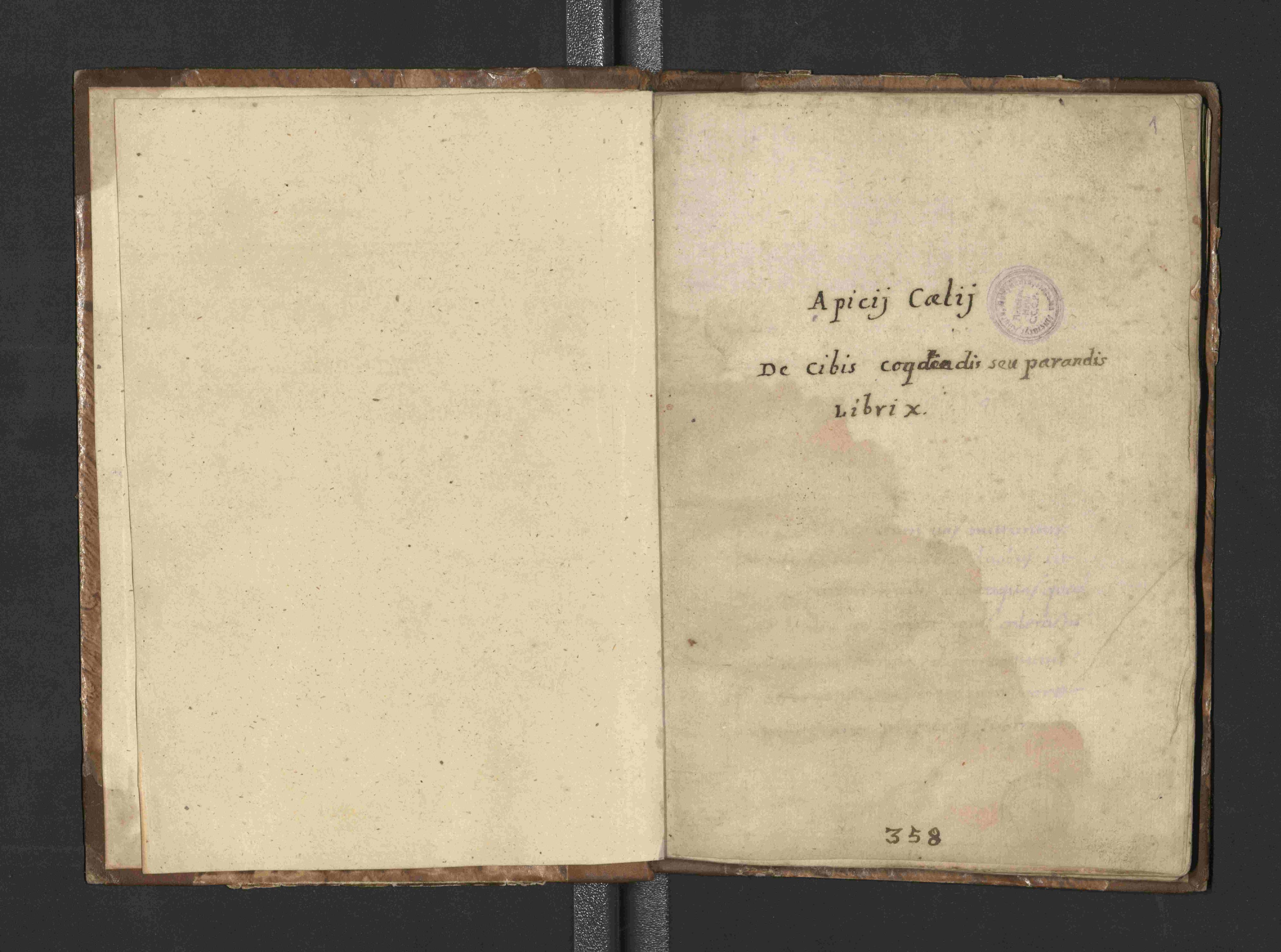 Первая копия «Апиция» в коллекции Н.П. Лихачёва – это кодекс XV века под заглавием «Арісіі Caelij de cibis coquendis seu parandis libri X» (Архив СПбИИ РАН. ЗЕС. Колл. 46. Карт. 627. Ед. хр. 1). Как сообщает сам Николай Петрович: «В 1903 году мне удалось достать из Лондона по аукционному каталогу известной Фирмы Sotheby, Wilkinson and Hodges небольшую рукопись, содержащую текст сочинения римского писателя императорского периода Апиция, автора сочинения, по теме и содержанию не совсем обычного, а именно “De re culinaria”, с рецептами римских гастрономов» (Лихачев Н.П. Гуманистическое письмо и автографы гуманистов. Рукопись, коллационированная Анджело Полициано // Известия Академии наук СССР. Серия VI. 1926. Том 20. Выпуск 10. С. 994). Кодекс представляет собой научное издание античного памятника, подготовленное видным итальянским ученым Анджело Полициано (1454–1494), которое должно было лечь в основу печатной книги и долгое время считалось утраченным.