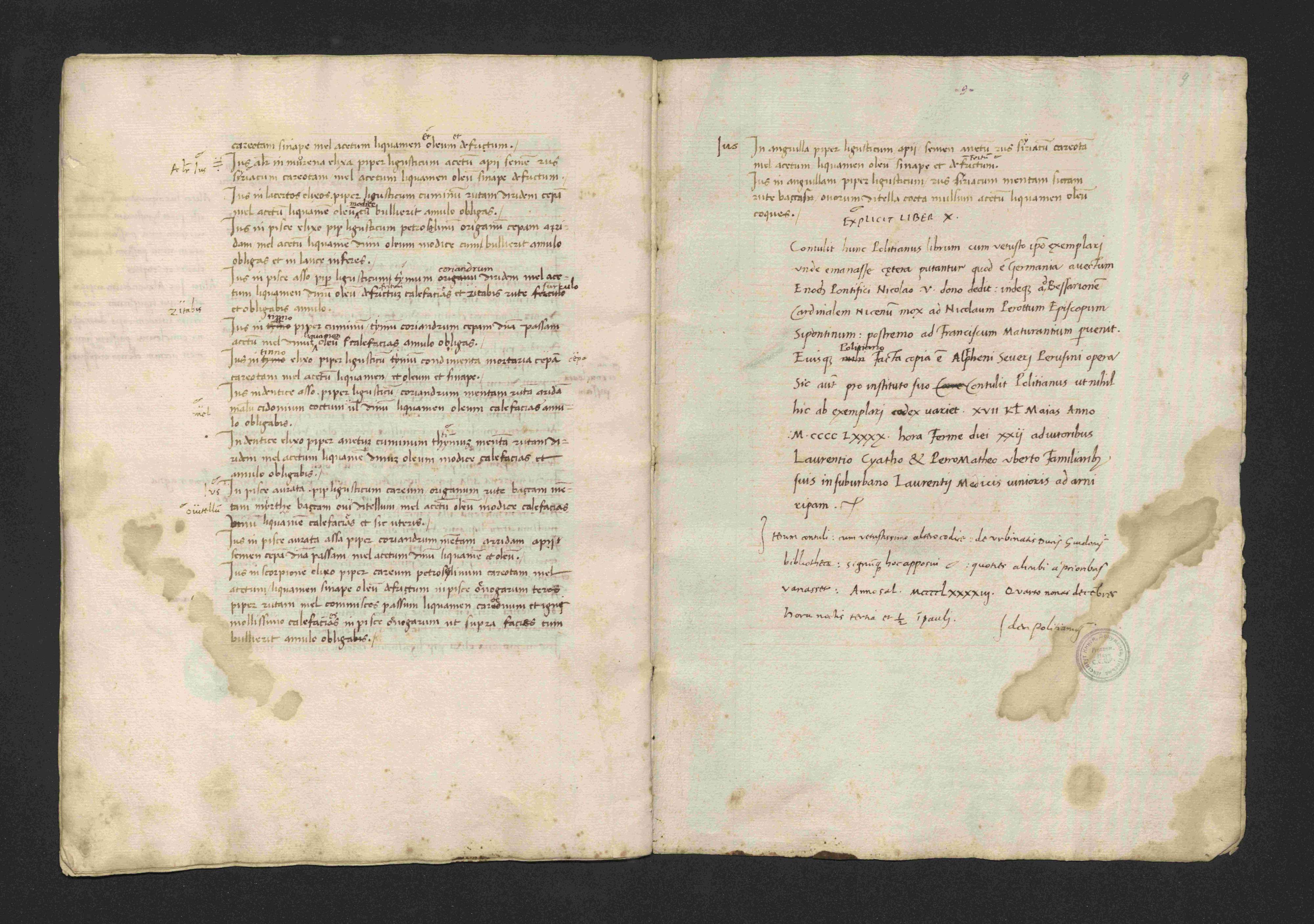 Вторая копия – тетрадь с фрагментом другого списка, написанного итальянским гуманистом Альфано Альфани (ок. 1465–1549) в конце XV века по заказу уже упомянутого Анджело Полициано (Архив СПбИИ РАН. ЗЕС. Колл. 46. Карт. 627. Ед. хр. 2). Как пишет Н.П. Лихачёв: «Происхождение тетради устанавливается точно: она находилась в распроданном на аукционе собрании проф[ессора] Константина Корвизьери, очень крупного коллекционера, имевшего удивительные вещи» (Лихачев Н.П. Гуманистическое письмо и автографы гуманистов. Рукопись, коллационированная Анджело Полициано // Известия Академии наук СССР. Серия VI. 1926. Том 20. Выпуск 10. С. 1003). Фрагмент содержит последнюю треть «Апиция»: конец VII книги «Politeles» (деликатесы), VIII книгу «Tetrapus» (блюда из мяса четвероногих животных – кабанины, оленины, козлятины, баранины, телятины, ягнятины, поросятины, зайчатины), IX книгу «Thalassa» (блюда из лангустов, кальмаров, каракатицы и прочих морских животных) и X книгу «Alieus» (блюда из рыбы). Документ является итогом работы Полициано над критическим изданием памятника и представляет собой рабочую тетрадь с результатами сверки текста с древнейшим списками, которые остаются таковыми и поныне. Первая сверка с рукописью IX века из библиотеки Лоренцо Медичи (нынешний Нью-Йоркский кодекс) была произведена 15 апреля 1490 года в 22 часа учениками Полициано, Пьерматтео Уберти и Лоренцо Чьятти, о чем одним из них сделана запись в конце текста. Вторая сверка тоже с рукописью IX века из библиотеки Гвидобальдо да Монтефельтро, герцога Урбино (в настоящее время хранится в Библиотеке Ватикана), сделана самим Полициано 2 декабря 1493 года в полчетвертого ночи.